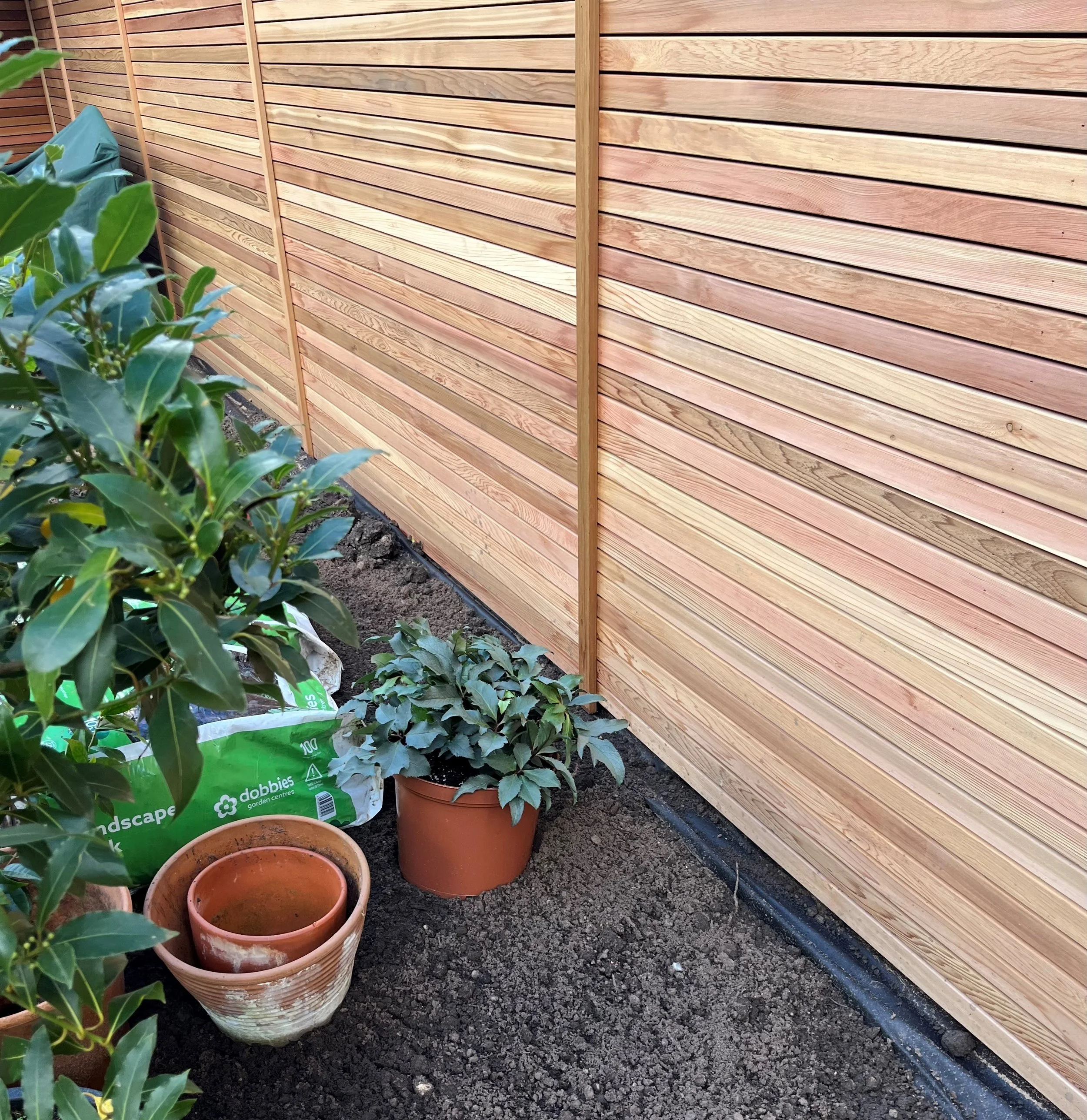 Another way to refresh fencing is via wood cladding, which is useful if you can’t remove the existing panels. The image below, taken during the build phase, shows new cedar wood cladding, which adds beautiful warm tones to the boundaries of this Warwickshire garden.